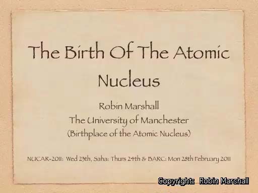 Here is a Quicktime movie version of the talk which I gave at several venues in India during February 2011. Click on the first page to play. There were changes made at each venue, but this version covers all versions. NUCAR-2011, Vishakapatnam Saha Institute, Kolkata B.A.R.C, Mumbai Robin Marshall asserts his right to be identified as the owner of the Intellectual Property Rights in this material. Some of the Audio/Video in the talk is subject to copyright and may not be copied or used or shown in public without the permission of Robin Marshall or James Maw. Any such use without permission will be subject to a minimum copyright fee of £500. By viewing the Quicktime movie of my talk, you acknowledge these conditions. |